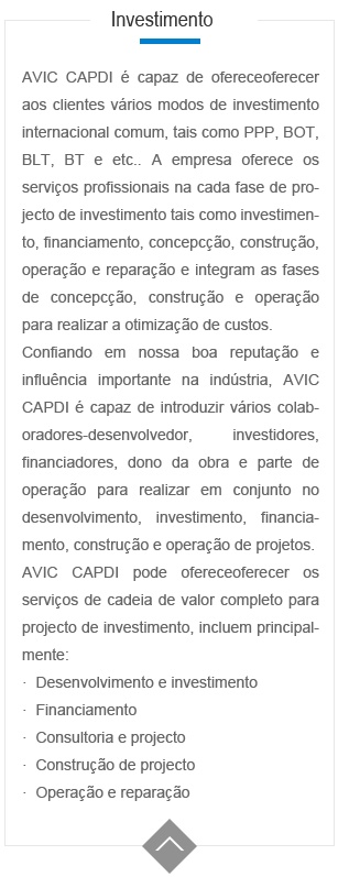 AVIC CAPDI pode ofereceoferecer os servi?os tais como engenharia, projecto arquitectótico, constru??o, protec??o ambientais e consultoria para áreas diferentes de clientes. Sempre ofereceoferecemos aos clientes com solu??o única, inovadora, custo baixo e eficiente. De avia??o civil e da avia??o geral, defesa nacional e bases militares para energia e estruturas ambientais, edifícios civis, instala??es industriais, edifícios farmacêuticos, AVIC CAPDI tudo pode ofereceoferecer os servi?os de planejamento profissional, projeto e constru??o, a fim de ultrapassar consistentemente as expectativas de nossos clientes.